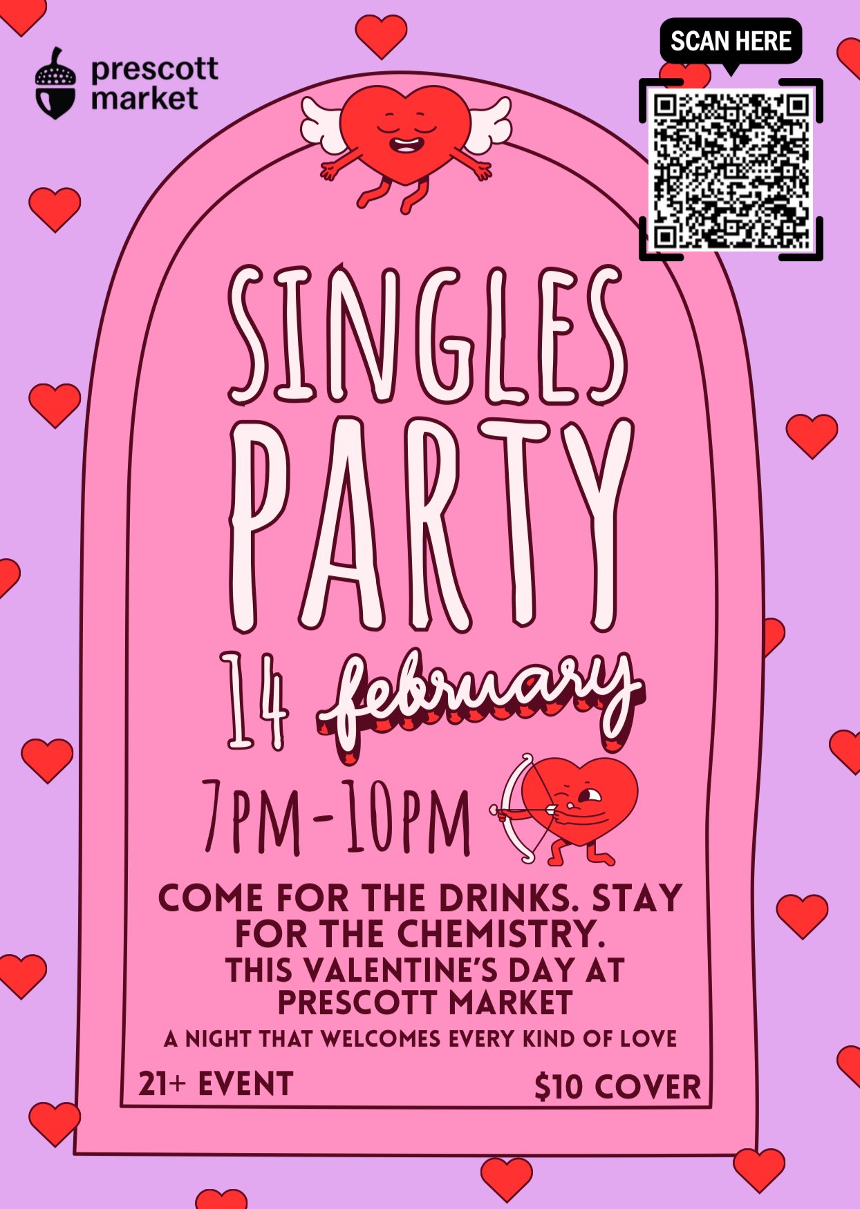Single this Valentine’s Day? Perfect. Join us for a Valentine’s Singles Party at Prescott Market, Feb 14 7pm to 10pm. Come for the drinks, stay for the chemistry. All love is welcome! Good food, great drinks, and even better conversations. Who knows what might spark?